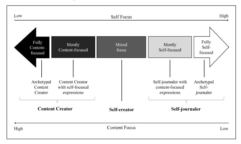 O paper também indica um limiar: perfis com cerca de 70% ou mais de posts content-focused tendem a ser percebidos como content creators, enquanto perfis com predominância equivalente de self-focused posts tendem a ser vistos como self-journalers.