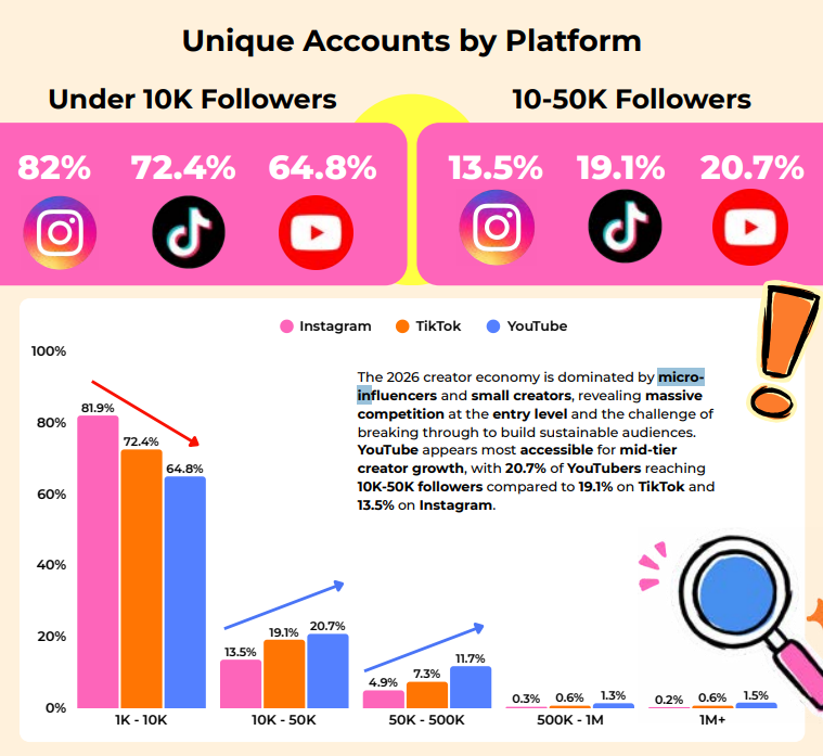 O relatório sintetiza: "A economia dos criadores em 2026 é dominada por microinfluenciadores e criadores pequenos, revelando uma competição massiva no nível de entrada e o desafio de romper para construir audiências sustentáveis."